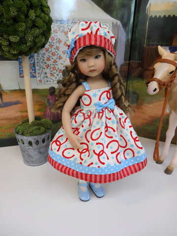 This darling sundress ensemble is a great addition to any Little Darling's wardrobe. The sundress is made of a precious horseshoe print in brick red with sky blue stars on cream cotton. The fully lined bodice has tiny contrast straps made from sky blue polka dot print cotton. A sky blue polka dot ribbon bow adorns the bodice waist. The skirt is full and gathered at the waist for a wonderful silhouette with an inset of sky blue polka dot cotton above the contrast brick red striped print cotton band at the hem. The dress fastens in back with buttons. Complete the look with the matching hat. The hat is made of horseshoe print gathered to a contrast hat band of brick red striped print cotton. A sky blue polka dot ribbon bow is featured on the hat band.