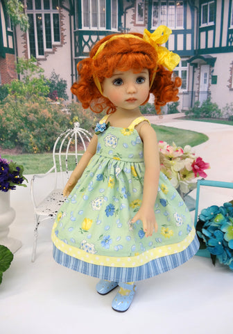 This adorable sundress ensemble is a great addition to any Little Darling's wardrobe. The sundress is made of a sweet piggy print with floral print in white, wedgewood blue and yellow on mint green cotton. The fully lined bodice has tiny contrast straps made from butter yellow polka dot cotton. Two blue ribbon flowers adorn one strap. The skirt is full and gathered at the waist for a wonderful silhouette with an inset of butter yellow polka dot print cotton above the contrast wedgewood blue stripe print cotton band at the hem. The dress fastens in back with buttons. Add the yellow crinkle ribbon to tie in her hair for a cute and simple hairstyle.