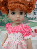 This darling ensemble is a perfect addition to any Little Darling's wardrobe for Valentine's Day. The dress is made of a precious striped heart print in pink on baby pink cotton. The bodice is fully lined and features a contrast overlay of pink gingham print cotton embellished with pink rick rack across the chest. A pink ribbon bow adorns the bodice. The short sleeves are made of contrast pink gingham print cotton with pink rick rack at the heart print sleeve cuff. The skirt is full and gathered at the waist for the proper silhouette with pink rick rack above the pink gingham print cotton at the hem. The dress fastens in back with buttons.