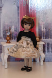 Black patent mary jane shoes with metallic gold tights complete the look. The tights are made by Wendy at Doll Secrets.