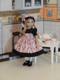 This precious ensemble is a pretty addition to any Little Darling's wardrobe. The dress is made of a beautiful love potion print in black filigree frames on pink cotton. The bodice is fully lined and features a contrast overlay of black swirl cotton in front embellished with black crochet lace. The short banded sleeves are also made from black swirl cotton with black crochet lace at the sleeve band. The skirt is embellished with a contrast band of black swirl cotton trimmed with black crochet lace above the hemline. The dress fastens in back with buttons. Finish the look off with the matching hat. The hat is made of love potion print gathered to a contrast hat band of black swirl cotton. A pink heart button is featured on the hat band.