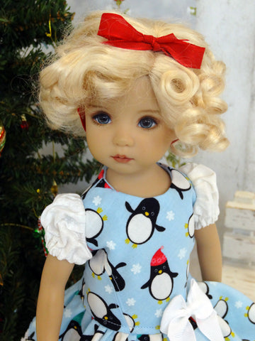 This delightful dress is the perfect addition to any Little Darling's wardrobe for the holiday season. The drop waist dress is made of a darling penguin print with hats in jade green and red on white snow printed sky blue cotton. The bodice is fully lined with princess seams in front for shaping. The short sleeves are made of contrast white snowflake print cotton and have elastic gathered at the upper arm. The short gathered skirt is trimmed in white pom pom trim at the hemline. A white ribbon bow embellishes the drop waistline. The dress fastens in back with buttons. Add the red ribbon for a sweet and simple hair style.