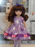 Purple ankle strap shoes with lavender tights complete the look. The tights are made by Wendy at Doll Secrets.