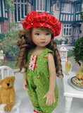 This cute ensemble is a pretty addition to any Little Darling's wardrobe. The romper is made of a sweet red cherry print on green cotton. The fully lined sleeveless bodice has a mock placket down the front of white beading over red ruffled ribbon. The pants feature gathers in the front at the waistline and contrast bands of red plaid print cotton trimmed with white crochet beading at the ankle. The romper fastens in back with buttons. Wear the playsuit alone or pair with the coordinating jacket. The bolero jacket is made of red plaid print cotton and is fully lined. The jacket features short sleeves gathered at the shoulder with a red ribbon bow. Complete the look with the coordinating beret. The beret is also made of red plaid print cotton embellished with a red ribbon bow on the hat band.